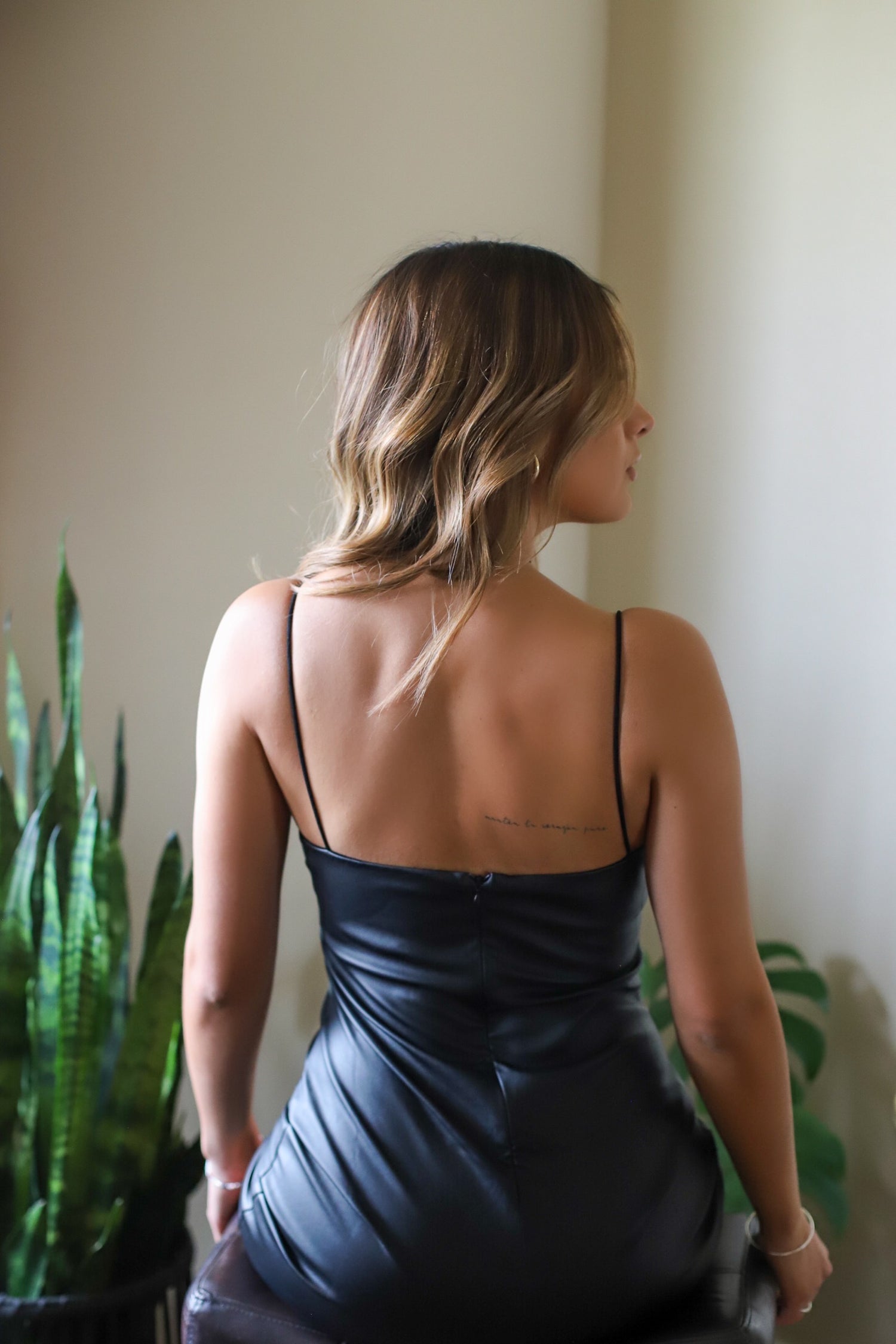 Black faux leather mini body con dress with spaghetti straps and back zipper closer.
